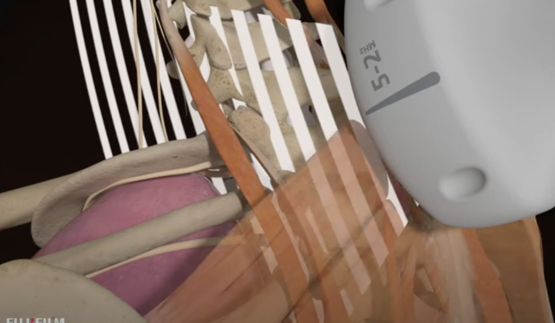 Đưa kim theo kỹ thuật in-plane, từ hướng đầu hoặc đuôi. Kim cần đi xuyên qua các lớp cơ Thang và Trám.