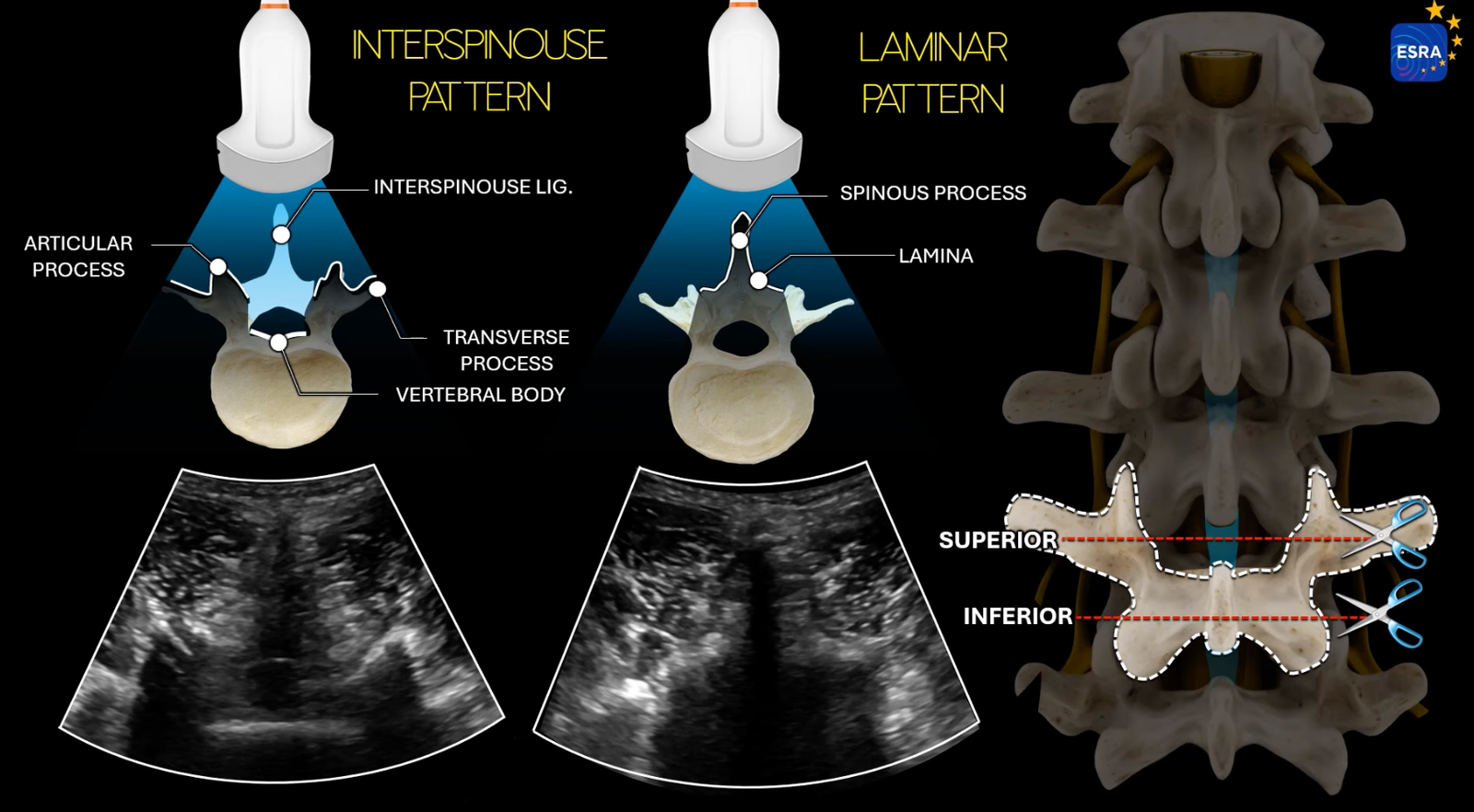 - Mô hình Liên phiến (Interlamina Pattern): Bóng phản âm từ mỏm gai của đốt sống trên có thể làm khó khăn trong việc hình dung Phức hợp Sau, nhưng Phức hợp Trước có thể được xác định.